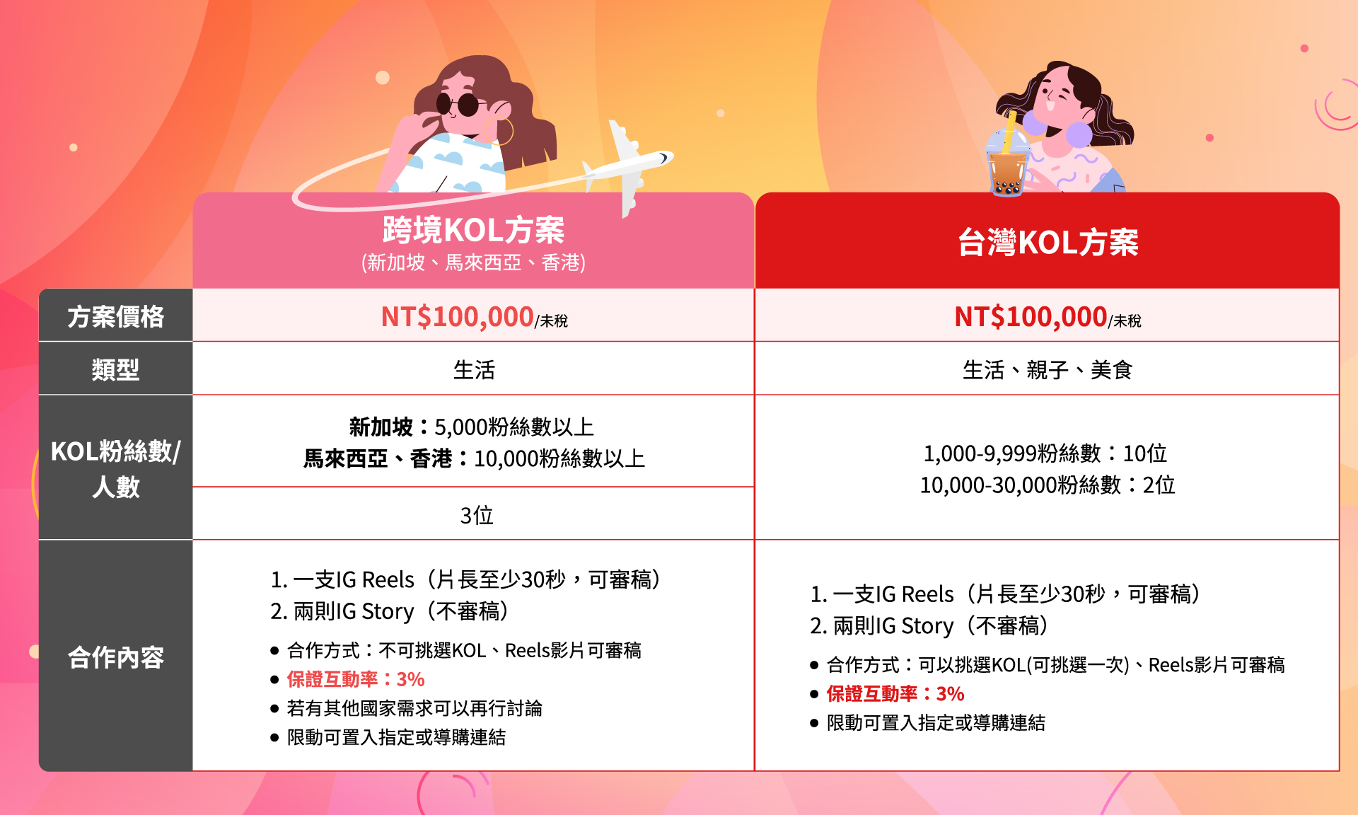 Reels 台灣市場還在持續擴張,仍處於流量紅利期,結合導購力、影響力強的 KOL 在社群運用短影音抓住群眾目光,能為品牌大幅提升曝光及知名度。AsiaKOL 擁有網紅行銷合作的豐富經驗,搭配自家 AIE 系統精準選用 KOL 人選,幫助品牌獲得最大效益,將提供 Instagram 短影音限定優惠方案: