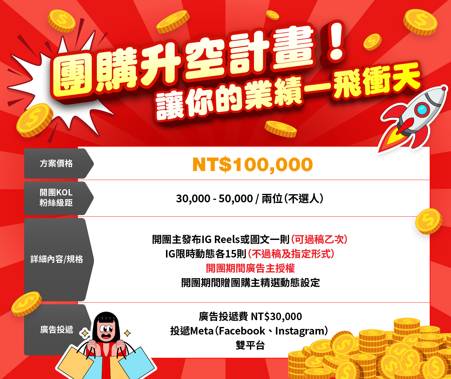 網紅團購是 2023 年起最盛行的行銷策略之一,成功的網紅團購也能為品牌帶來龐大商機,並降低高昂的廣告成本。不過品牌在執行 KOL 團購行銷時,必須謹慎挑選屬性合宜的網紅,從數據中觀察網紅的轉換率,並搭配 KOC、廣播專區等多項管道輔助,最大化網紅團購效益。委託專業的網紅行銷公司,能降低自行尋找 KOL 所面對的風險,AsiaKOL 過去有豐富的 KOL 行銷專案經驗,本次推出KOL 團購限定優惠方案,能協助品牌將單次的團購帶貨成效最大化,衝刺更亮眼的銷售業績!