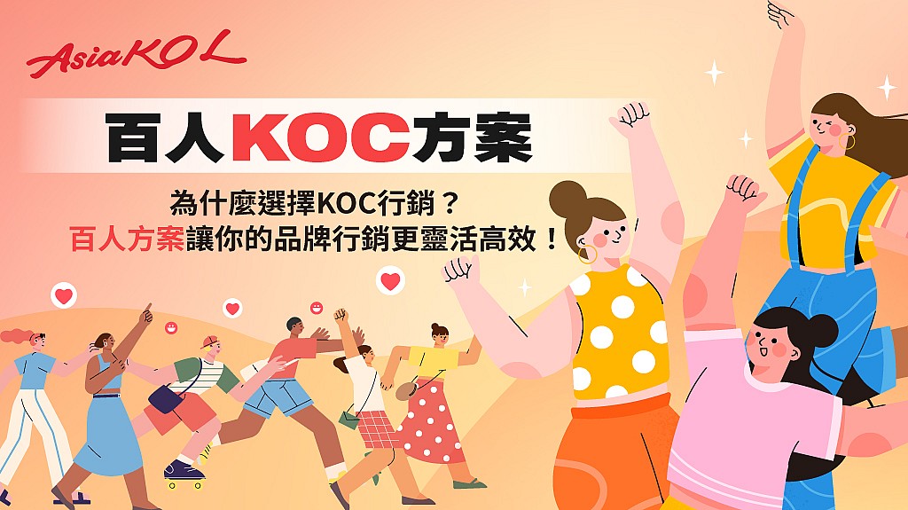 AsiaKOL 打造的「百人 KOC 方案」,善用 KOC 更高的互動率與行銷靈活度、更廣的受眾市場,以及更低的價格,旨在幫助品牌提高知名度並與消費者建立友誼橋樑,透過更高投報率的行銷策略,創造海量曝光與聲量,歡迎企業填寫需求報名!