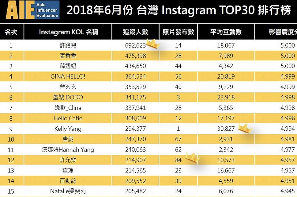 2018年6月份美妝Instagram最新排名結果揭曉!「AIE 台灣及亞洲網紅 KOL 資料庫」同時抓取 FB、YT、IG 社群數據,並依據各項指標進行綜合評分。根據 AIE 總體排名,想在美妝界成為前十大Instagram人氣王,追蹤人數至少須達到25萬人,顯見美妝KOL對消費者的影響力非常大。