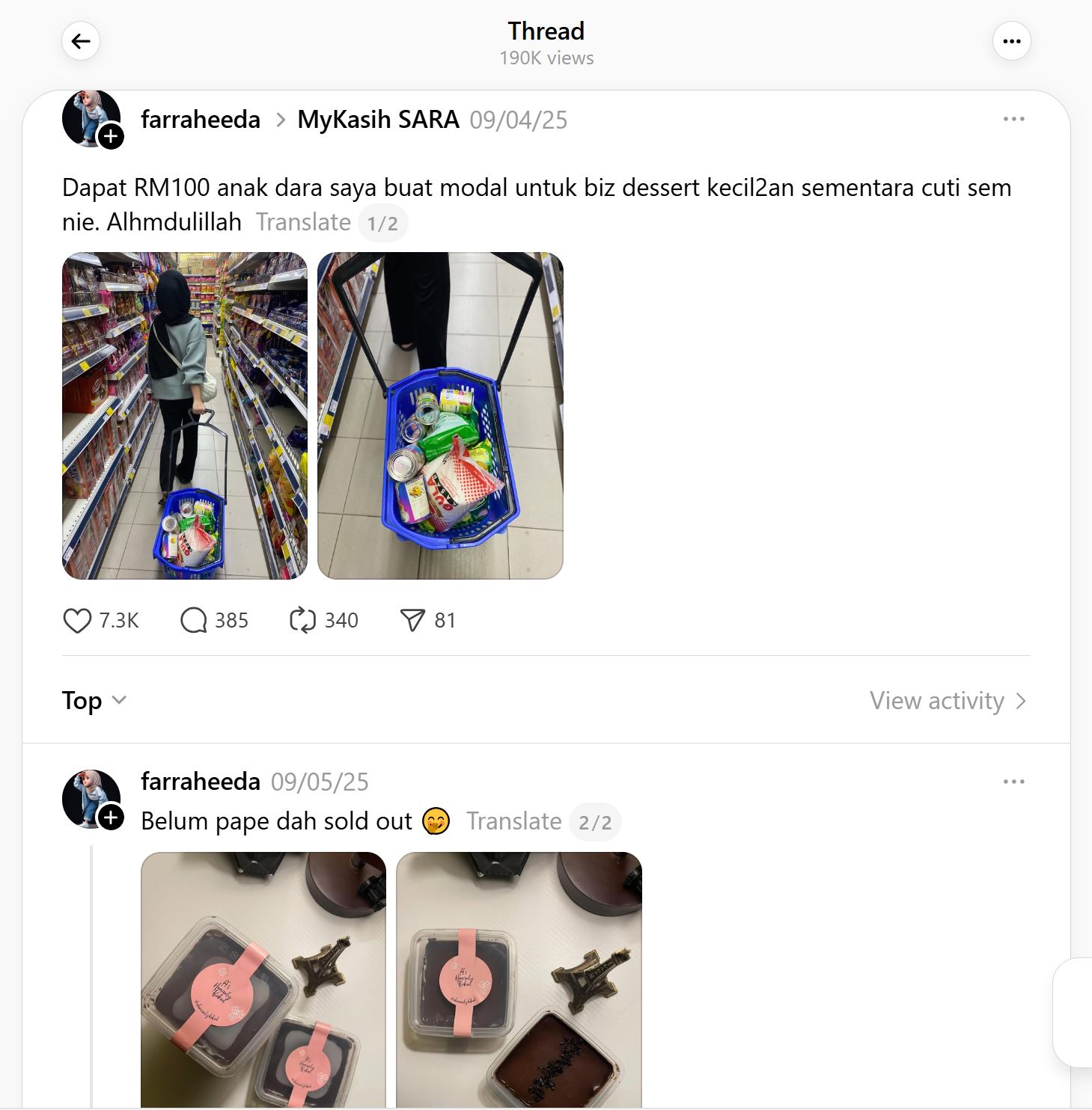 當馬來西亞政府推出 RM100 MyKasih 援助金時,大多數人選擇購買米、食用油等生活必需品;但來自 Bangi 的一位年輕女孩,卻用這筆錢開啟了自己的甜點事業。這不只是一次創業,更是一場充滿文化意涵的成功故事。她的母親在 Threads 上分享了這段經歷,引起廣大迴響: