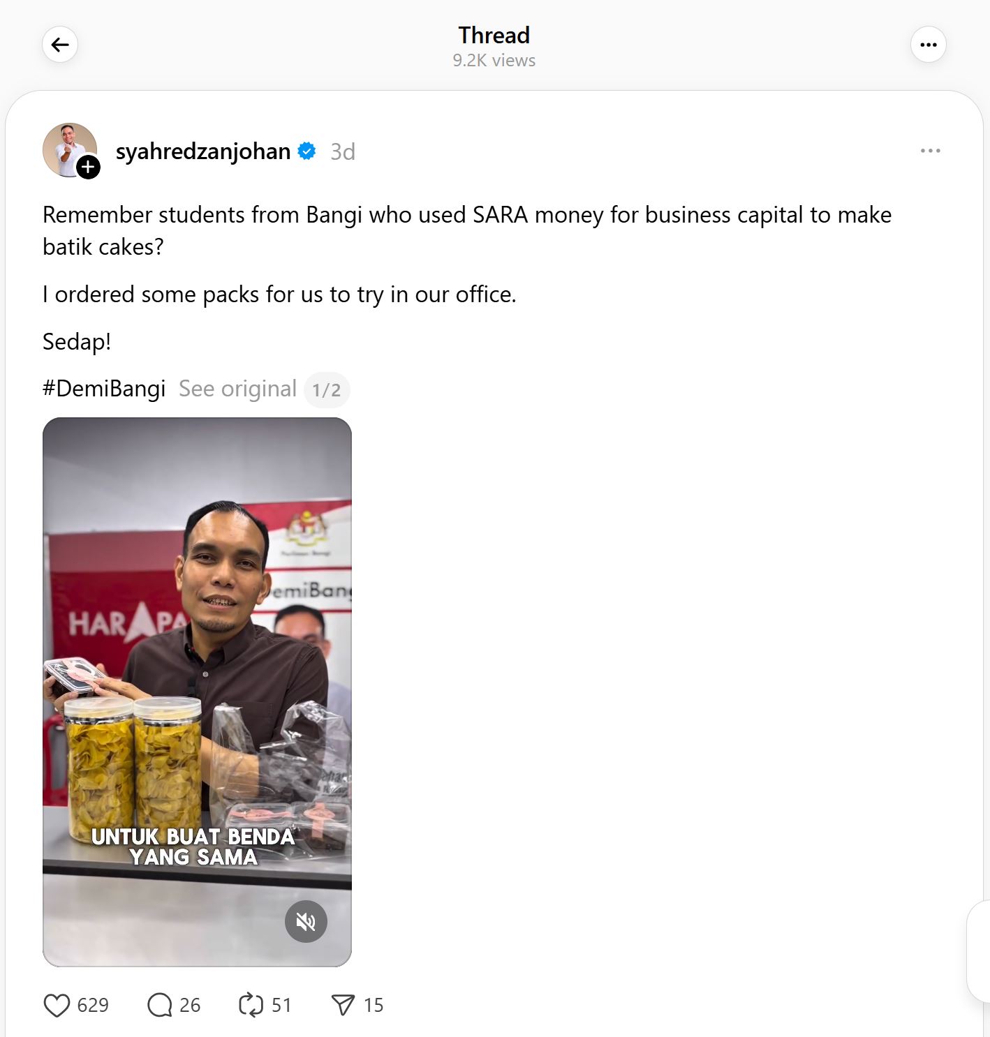 首批甜點迅速售罄,社群討論熱烈,甚至引來國會議員 Syahredzan Johan 的關注與訂購,他更在 Threads 上留言「Sedap!」(好吃),給予肯定這段故事隨後被《The Rakyat Post》報導,成為象徵馬來西亞「草根創業精神」的代表案例。