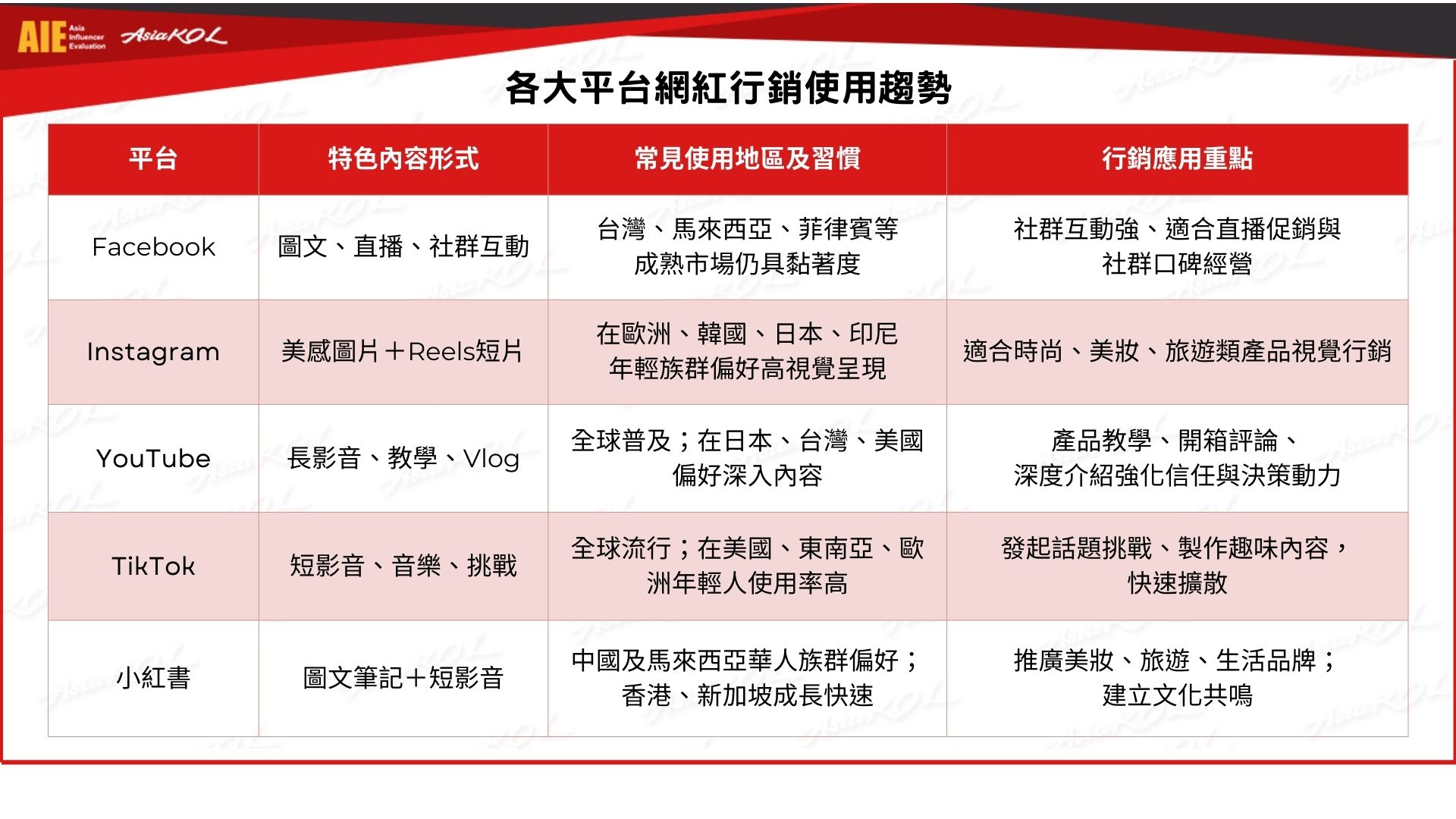 不同平台因受眾與地區差異,而形成各自獨特的使用習慣與內容風格,品牌需根據目標族群的特性,選擇適合的通路與合作網紅: