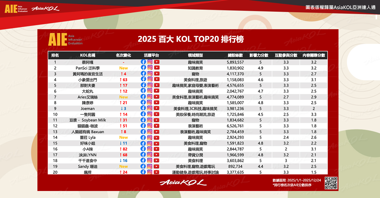 AIE 年度《2025 台灣百大 KOL 排行榜》正式發布。在社群平台快速演進、內容競爭日益白熱化的環境下,誰能持續站穩影響力高峰?哪些新勢力正快速崛起?這些關鍵訊號,都是品牌規劃網紅行銷策略時不可忽視的重要依據。為協助品牌與行銷人快速掌握頭部創作者的最新動態,我們首先聚焦競爭最激烈的 Top 20 KOL 榜單,從排名變化出發,解析 2025 年台灣網紅生態的核心趨勢。