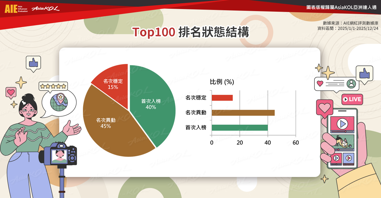 從整體榜單結構來看,2025 年的 KOL 排行呈現高度動態的變化。本次 Top 100 中,有多達 40 位創作者首次入榜,顯示市場對新聲音依然保持高度開放性。進一步觀察榜單結構可發現,前 50 名雖仍以成熟創作者為主,但名次變動幅度已經明顯加大;而後 50 名則呈現更劇烈洗牌現象,顯示中段與成長型創作者的競爭明顯升溫。