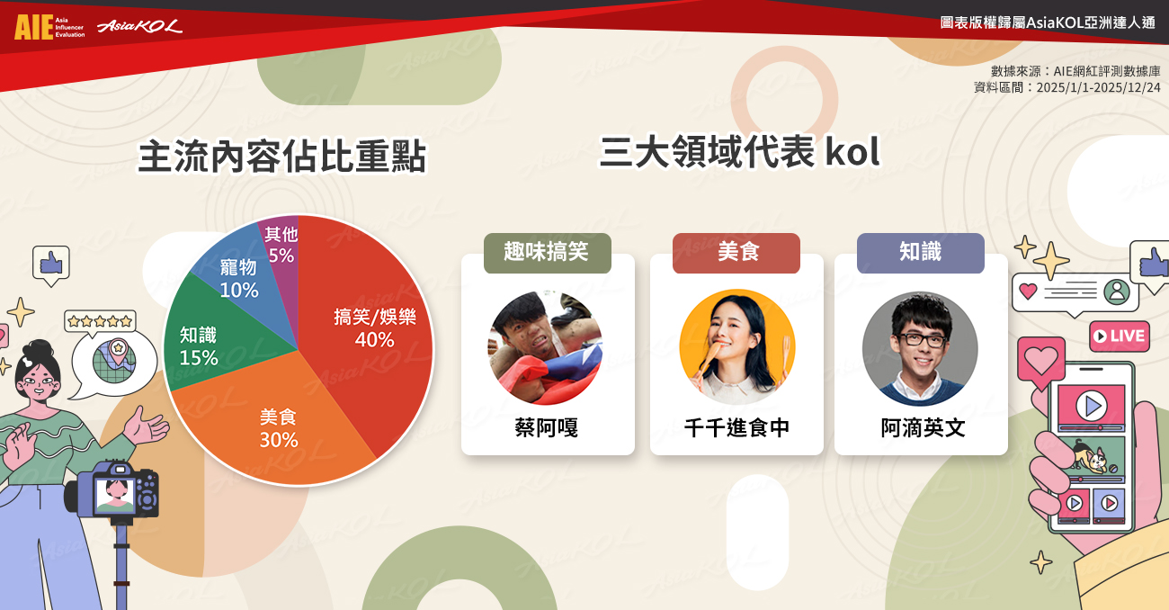 從內容類型分佈來看,2025 年台灣 KOL 生態仍由美食、娛樂(搞笑)、知識型內容三大主流穩定支撐。在競爭最激烈的 Top 20 榜單中,約七成創作者集中於美食與娛樂類型,顯示其對大眾市場的多元整合能力;同時,知識型創作者今年表現亮眼,成為榜單中不可忽視的關鍵類別,反映用戶對高價值、可學習內容的需求持續升溫。
