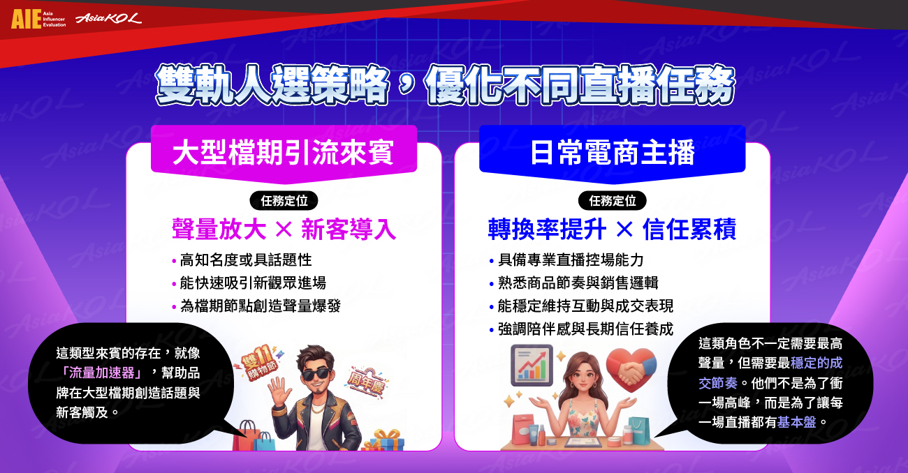 因此,雙方經由多次對焦後決定從任務本質出發,從頻率、檔期到營運目標釐清每一場直播的任務,並據此確立「雙軌人選策略」。重新思考直播分工與角色配置,為後續策略調整奠定更清晰的基礎。當角色分工清楚,成效自然更穩定。