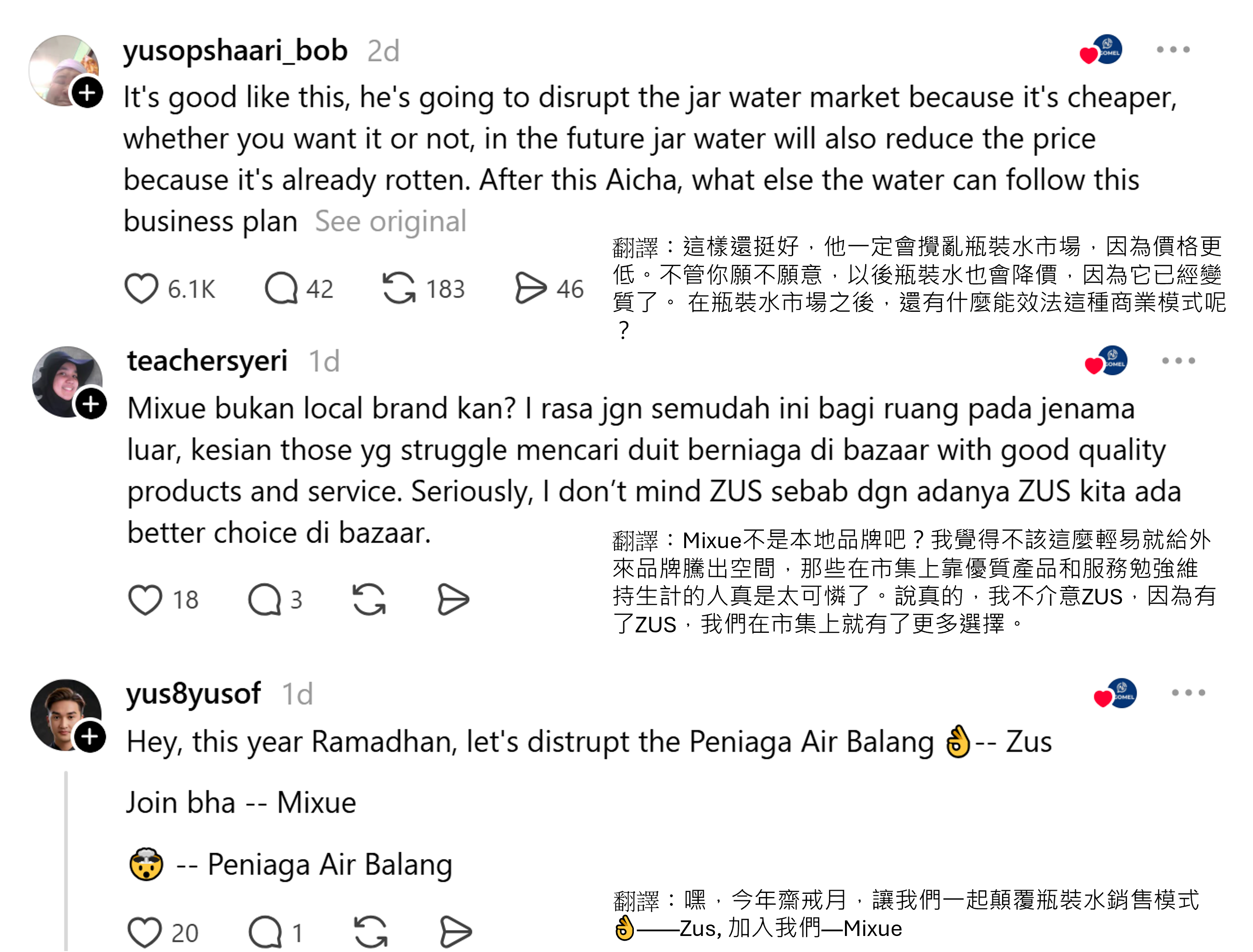 有趣的是,這次的品牌曝光並不只來自官方宣傳。消費者本身也成了最強大的推手。當大家在 Threads 上討論 Zus 與 Mixue 是否打破傳統市集樣貌,或帶來更多活力時,這些討論本身就成了品牌的免費廣告。