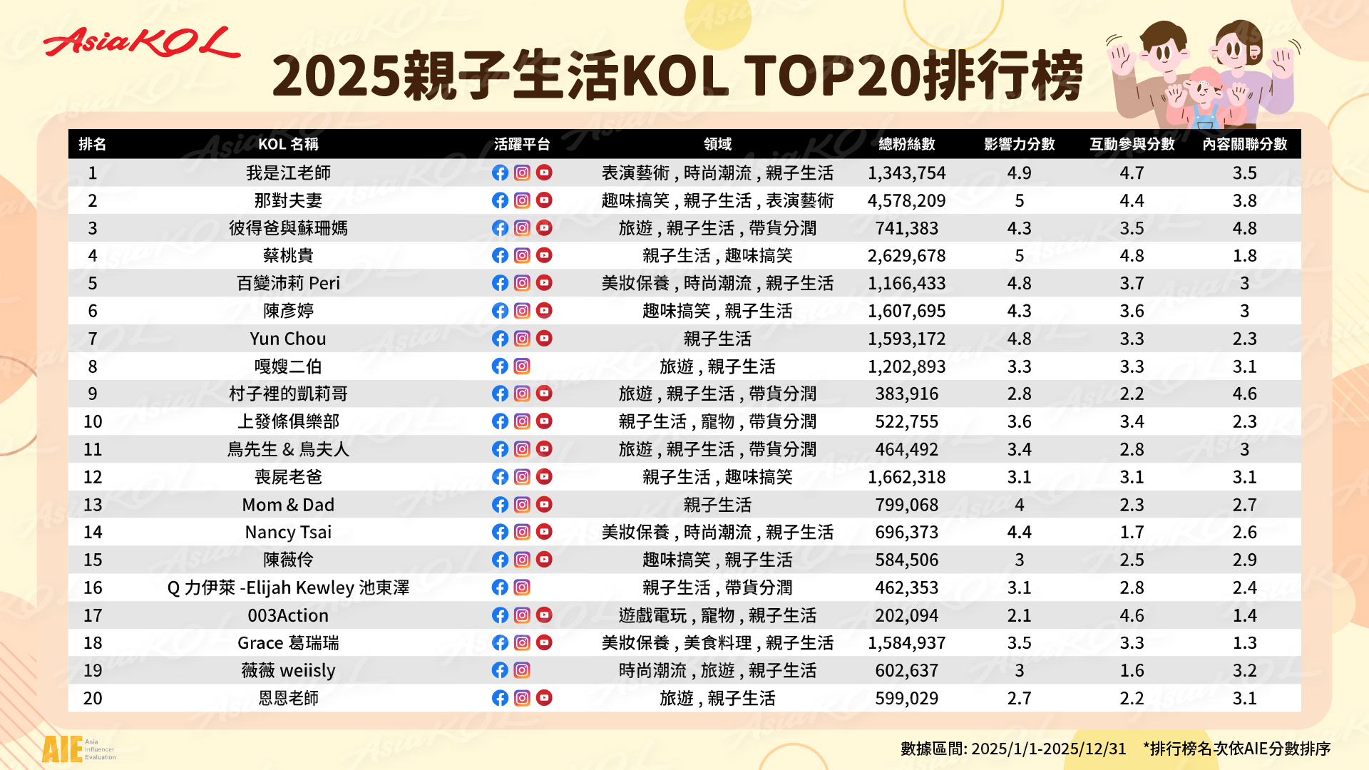 透過 AIE 數據資料庫,我們整理出 2025 親子生活網紅 TOP20 榜單,可以觀察到目前主流親子內容的幾個共通特徵。