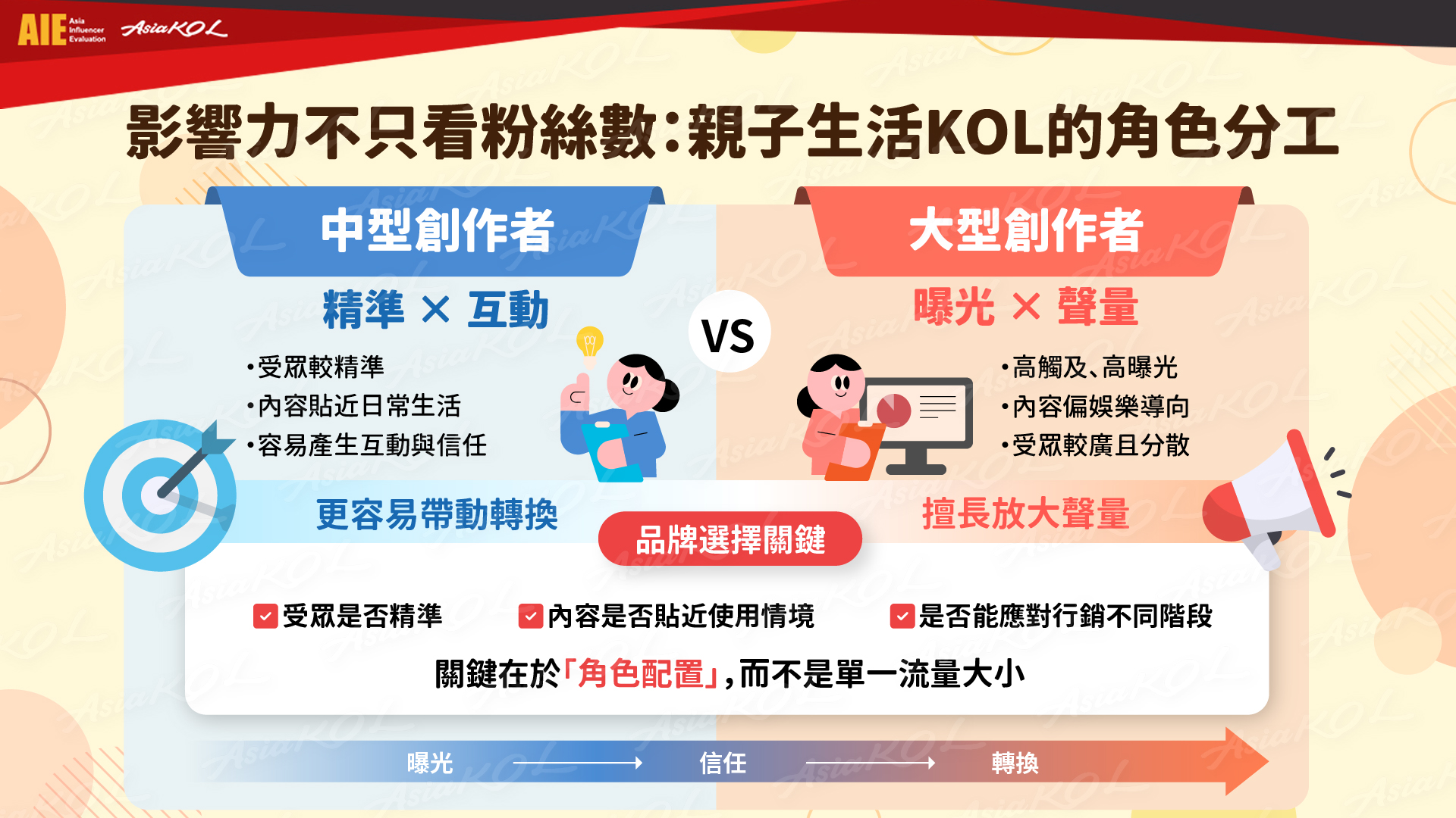 從整體來看,親子 KOL 已不再只是單一內容類型,而是逐漸形成「流量吸引、關係經營與消費影響」三種不同功能的內容分工。