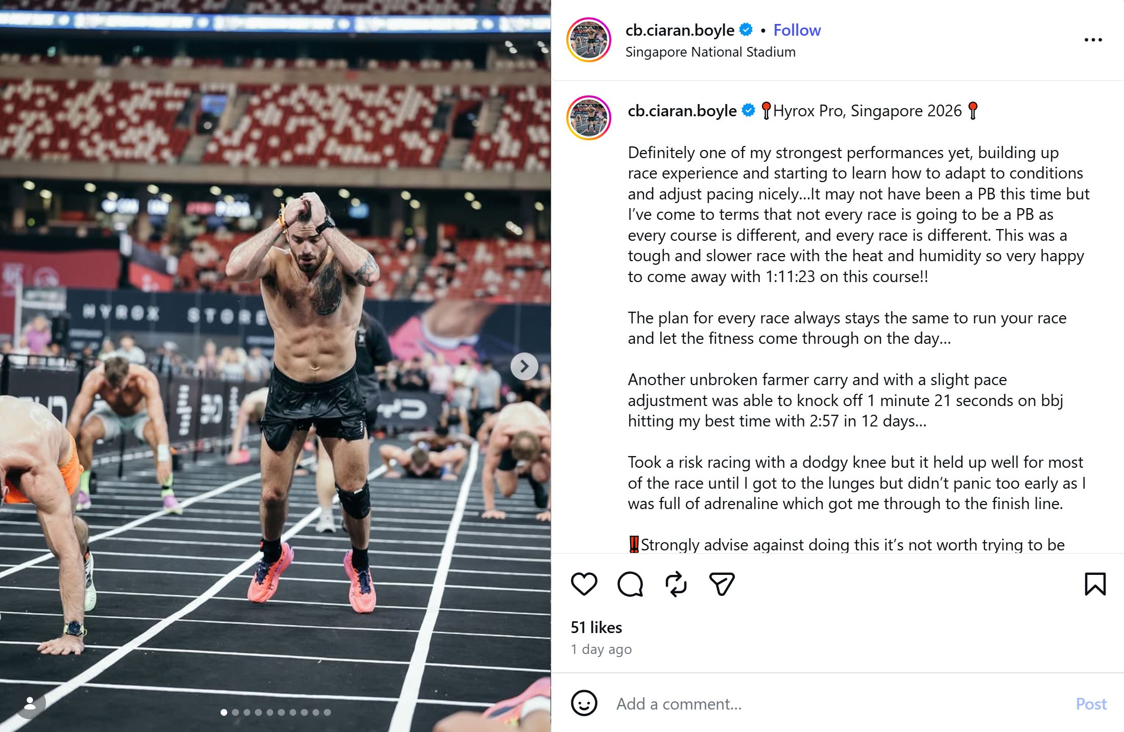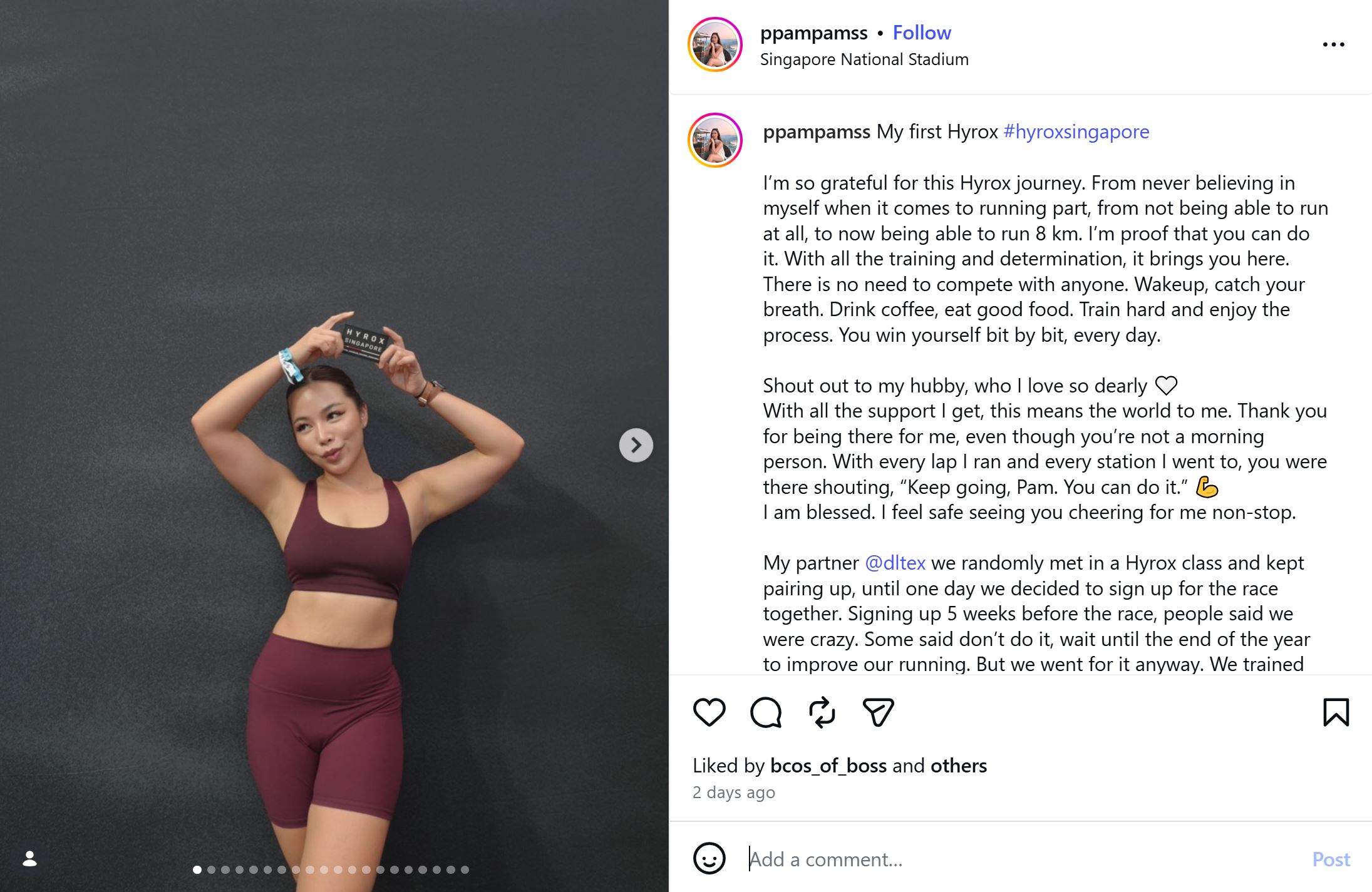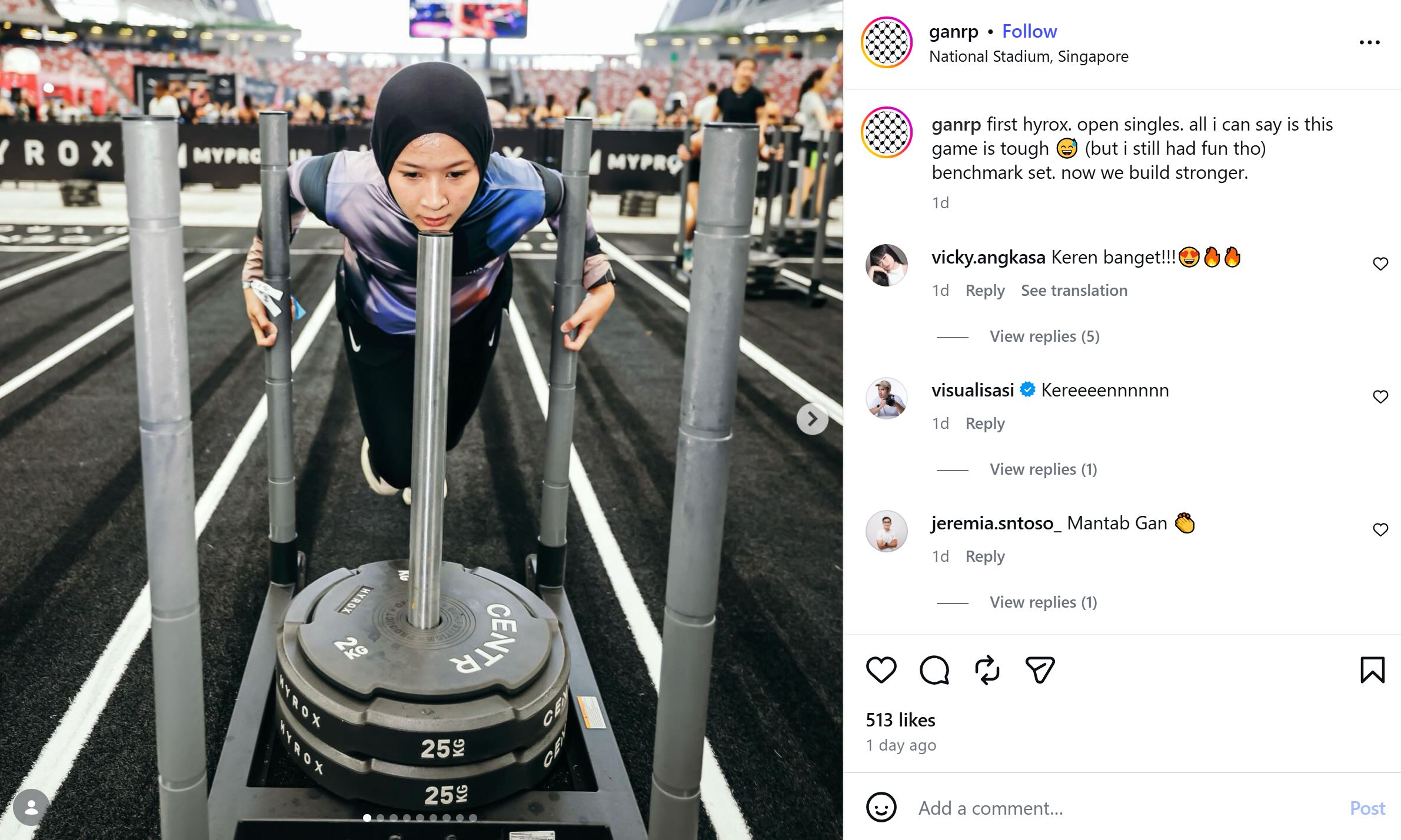 更值得關注的是,許多馬來西亞人也跨海參賽,在 Instagram 與 Threads 上分享訓練歷程、裝備與比賽心得。從健身運動網紅的專業訓練影片,到美妝、美食創作者的「比賽日 vlog」,HYROX 相關的內容在社群快速擴散。討論的焦點不僅限於成績,還延伸至出國參賽成本、裝備選擇、與訓練方式,這些延伸話題也近一步成為品牌行銷的切入點。