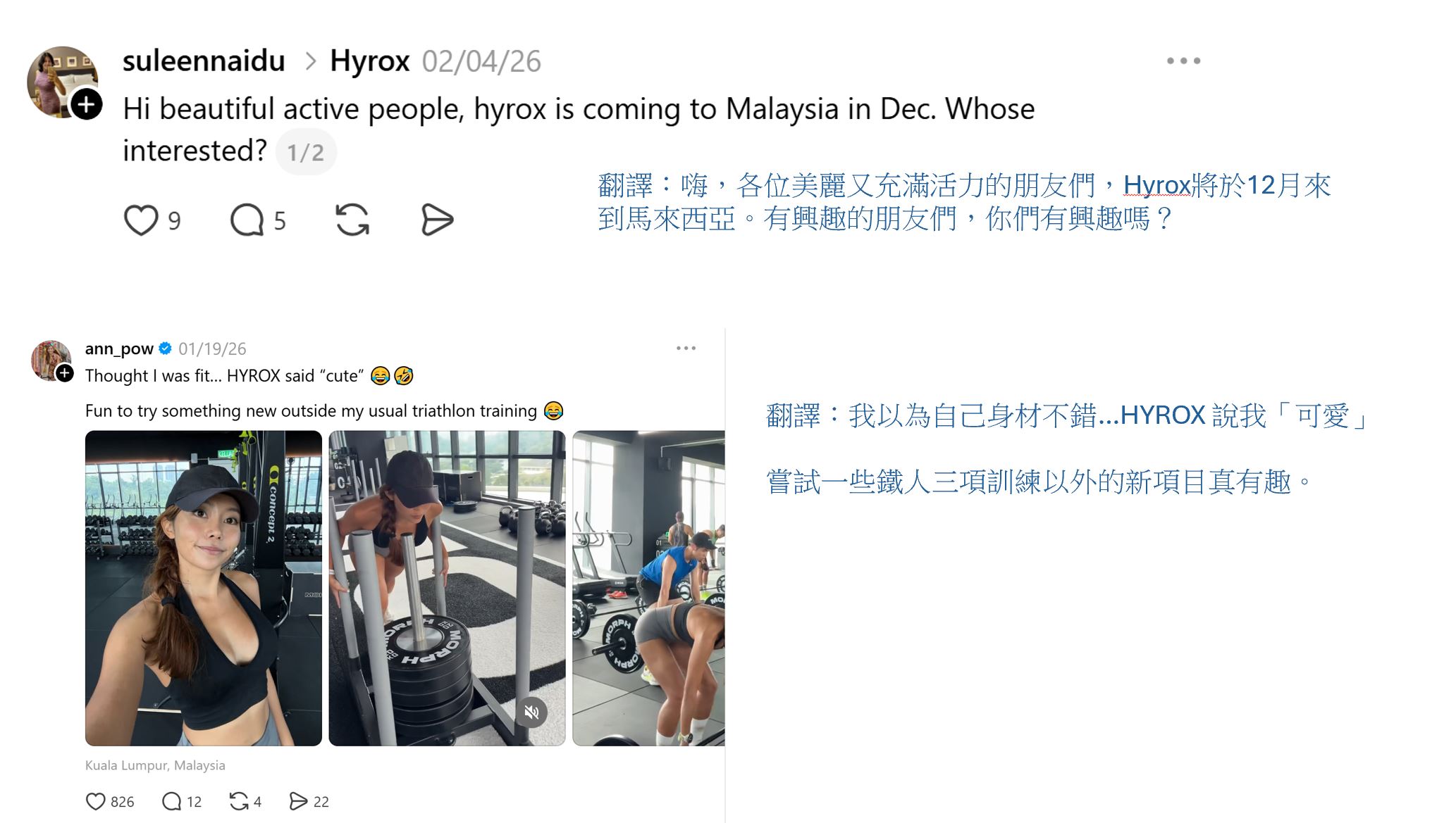 在 Threads 上,已經有不少人開始討論「要不要組隊去吉隆坡參加」、「參賽費用多少」、「需要準備哪些裝備」。這些討論顯示,HYROX 已經成為社群文化的一部分。
