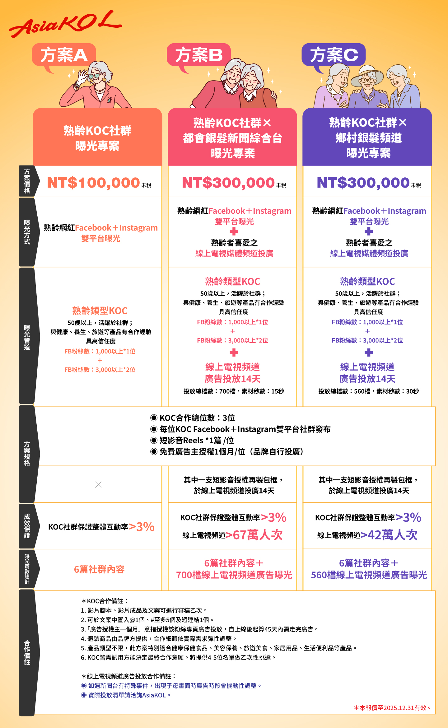 【 AsiaKOL 熟齡整合行銷方案,打造橘色經濟市場全方位觸及!】