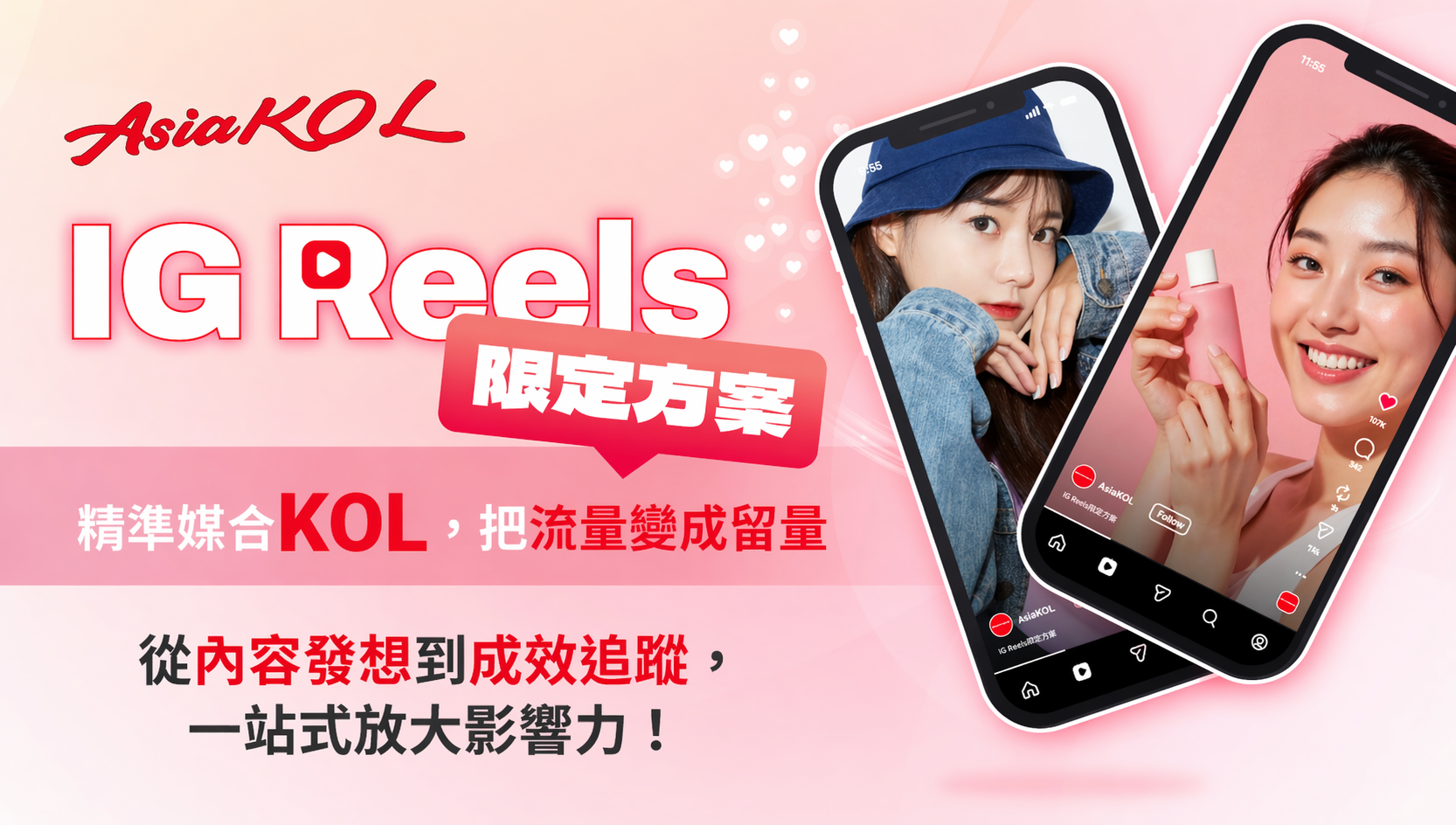 Reels 台灣市場持續擴張,仍處於流量紅利期!AsiaKOL 擁有網紅行銷的豐富經驗,搭配自家AIE系統精準選用KOL,幫助品牌獲得最大效益,將提供 IG短影音限定優惠方案。結合導購力、影響力強的KOL運用短影音抓住群眾目光,能為品牌大幅提升曝光及知名度。