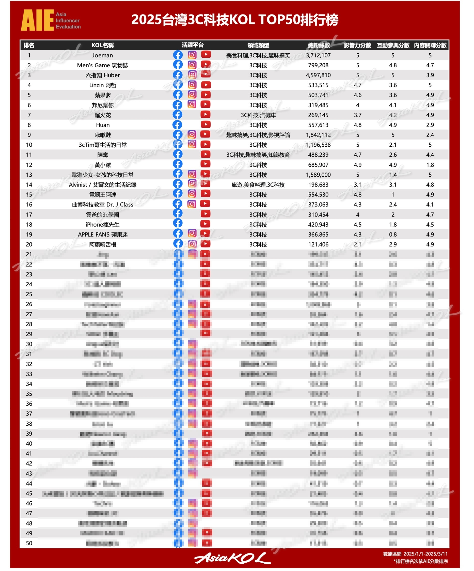 AsiaKOL網紅排行榜|台灣科技3C網紅排行